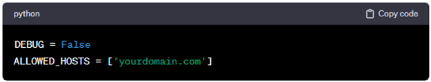 Django menyediakan sejumlah pengaturan keamanan yang dapat diaktifkan dalam pengaturan proyek Anda. Pastikan untuk mengaktifkan DEBUG pada mode produksi dan tetapkan ALLOWED_HOSTS hanya ke domain yang diizinkan.